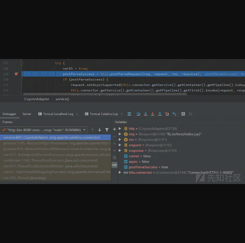经过调试分析,得知Tomcat是在CoyoteAdapter.service()函数上对请求URL进行解析处理的,直接在这里打上断点,此时的函数调用栈如下: