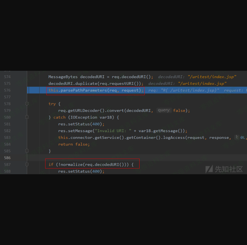 跟进postParseRequest()函数中,其中先后调用parsePathParameters()和normalize()函数对请求内容进行解析处理: