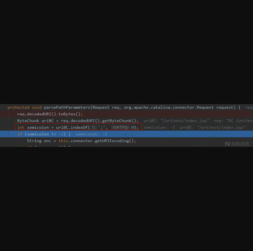 这里我们先跟进parsePathParameters()函数,先是寻找URL中是否存在;号,找到的话才会进入下面的if代码逻辑: