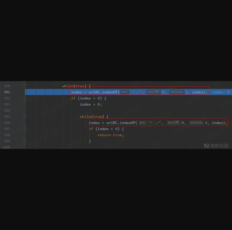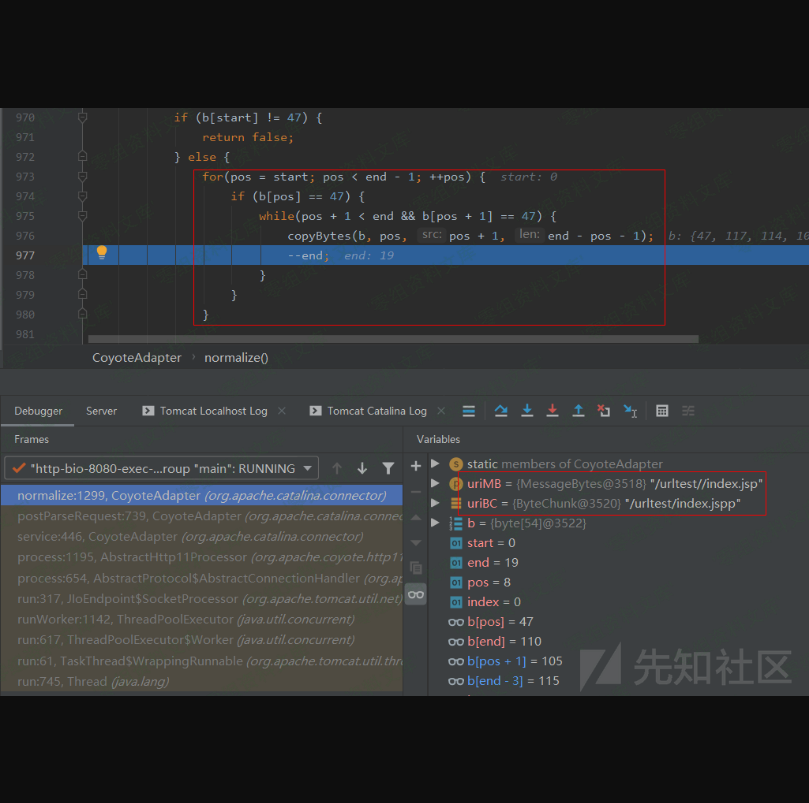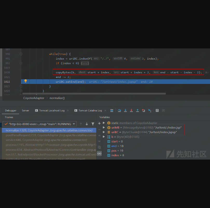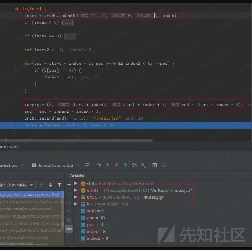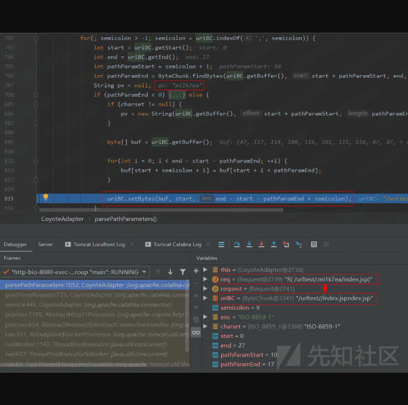 如果找到了;号,在if代码逻辑中后面的循环体会将;xxx/中的分号与斜杠之间的字符串以及分号本身都去掉,我们访问http://localhost:8080/urltest/;mi1k7ea/index.jsp再试下,就可以进入该代码逻辑调试看到(代码中ASCII码59是;,47是/):