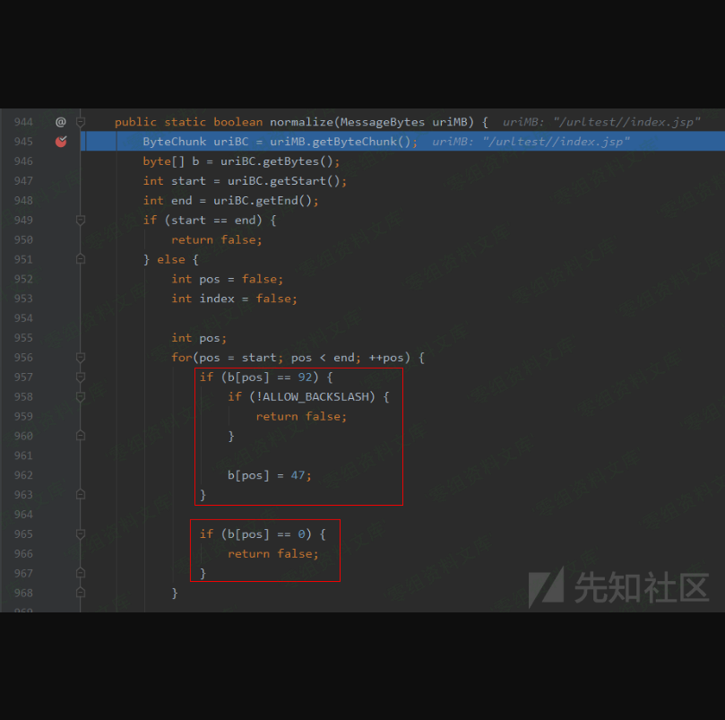 由此可知,normalize()函数对经过经过parsePathParameters()函数过滤过;xxx/的URL请求内容进标准化处理,具体为将连续的多个/给删除掉只保留一个、将/./删除掉、将/../进行跨目录拼接处理,最后返回处理后的URL路径。