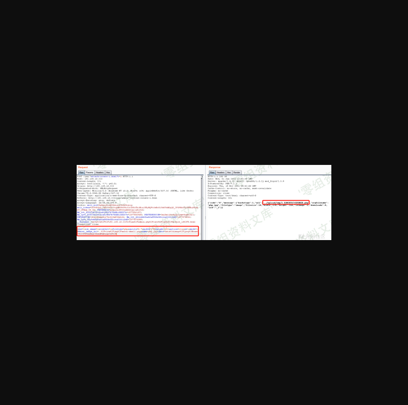 第三步,修改post包中"filetype"参数类型为"php";经分析 "data"参数为base64加密,这里我们将测试数据""经过base64加密等构造,形成"data"参数的数据:data%3Aimage%2Fjpeg%3Bbase64%2CPD9waHAgcGhwaW5mbygpOz8%2B,最后数据包放行,返回成功上传为php文件的路径: