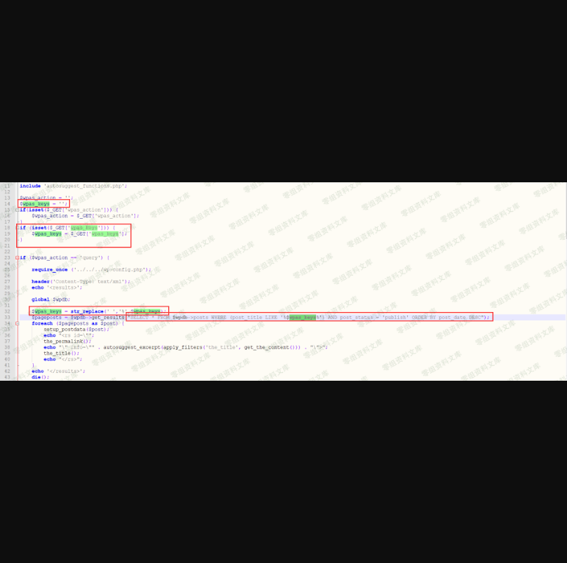 相信大家没看几行就看出了问题的所在,变量wpas_keys是直接获取GET中的wpas_keys。一点都没过滤,并且在下面代码中,变量wpas_keys也带入数据库中查询了(wpdb是wordpress操作数据库方法),于是SQL注入就产生了。