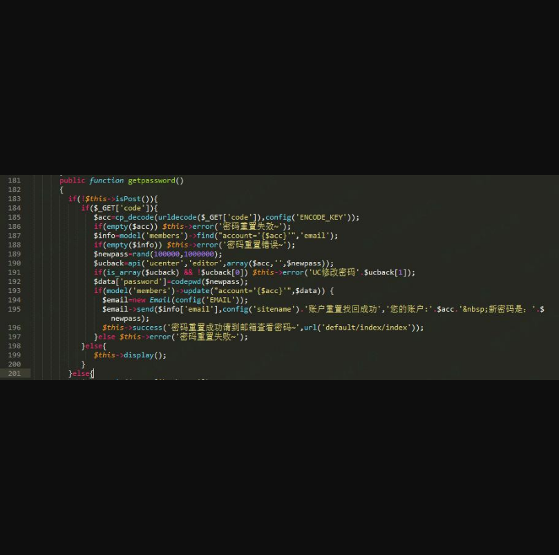 从框架上(基于CanPHP的二次开发)看不出来什么缺陷,那就来看看代码逻辑上有什么披露。来到protected/apps/member/controller/indexController.php中是一些关于会员账号的逻辑,其中的getpassword函数是找回密码的功能,其中分为两步:第一步根据用户名或者邮箱向注册的邮件发送重置密码链接;第二步根据重置密码的链接重置用户密码,然后再将新密码发送到对应邮箱。第二步代码如下: