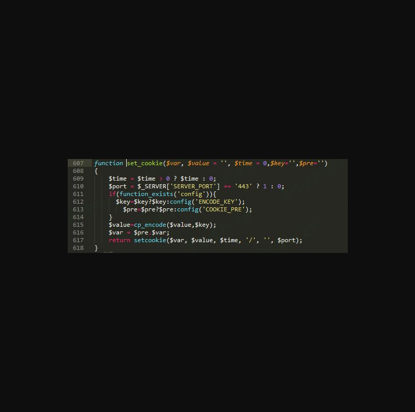 跟进set_cookie函数,是在protected/include/lib/common.function.php中607行定义,如下: