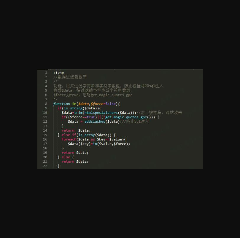其中会对account的格式进行校验,ip也是正则匹配的结果无法伪造,那么可控的就只有nickname了,我们可以跟踪一下nickname的过滤过程,首先是进入common.function.php的in函数: