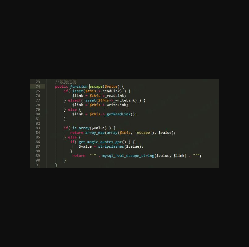 我们可以考虑考虑二次注入的可能性,但还是需要跟踪一下在regist时insert数据是如何过滤的,最后可以跟到在protected/include/core/db/cpMysql.class.php中escape函数对数据进行了过滤: