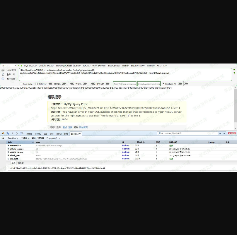 所以我们可以注册个带单引号nickname的账号,注册成功后退出重新登陆,使用auth cookie来作为重置密码的code,就会产生报错,如下(因为在解密的时候会把code进行urldecode,所以需要把cookie中的+改为%252B,/改为%252F):