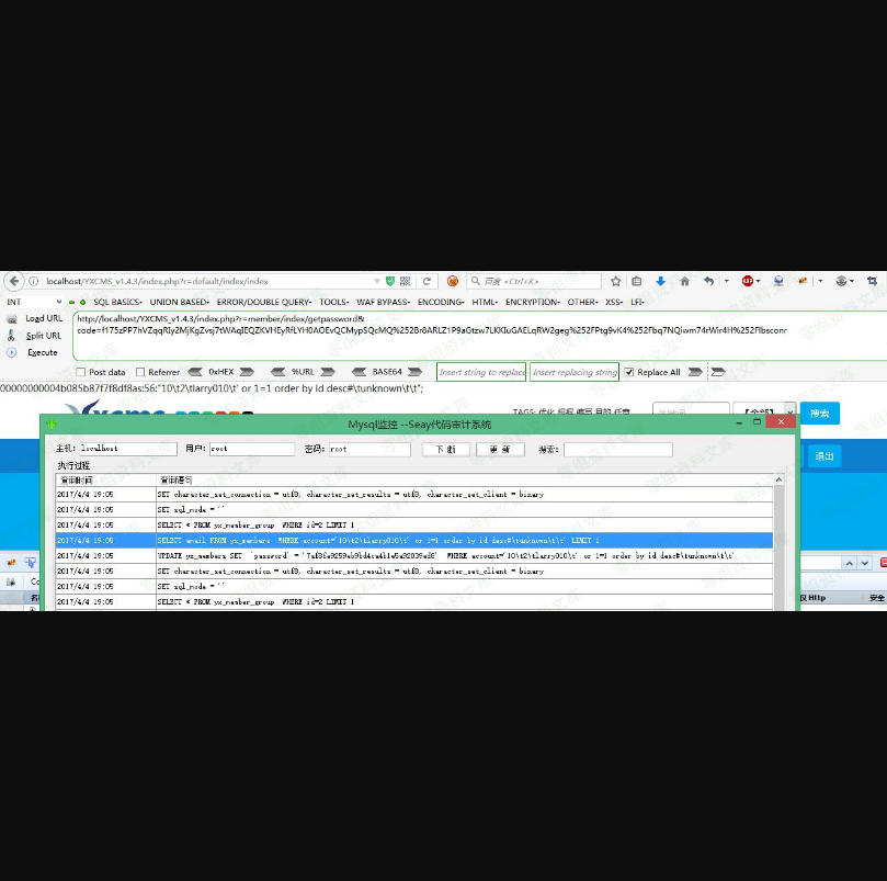 然后注册账号,重新登陆,直接上code访问,可以监控到mysql执行语句如下: