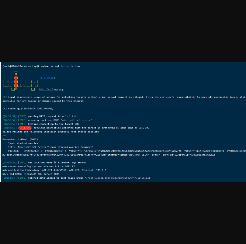其中注入的参数为 POST数据中的 txtUser 参数, 保存为文件使用 Sqlmap跑一下