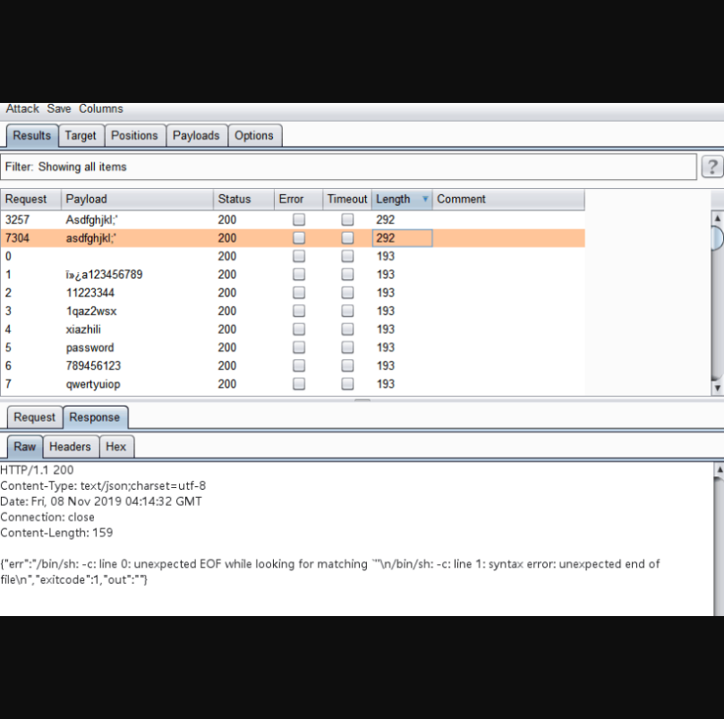 当burpsuite爆破完成时,注意到POST数据中如果带有 ;' ,响应数据包发生异常。