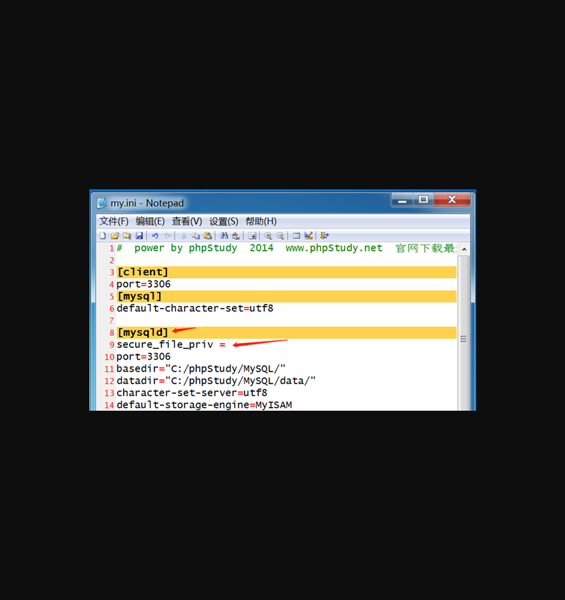 修改mysql.ini 文件,在\[mysqld\]下添加条目: secure\_file\_priv =,保存然后重启phpstudy,不然用mysql写入文件会报错。