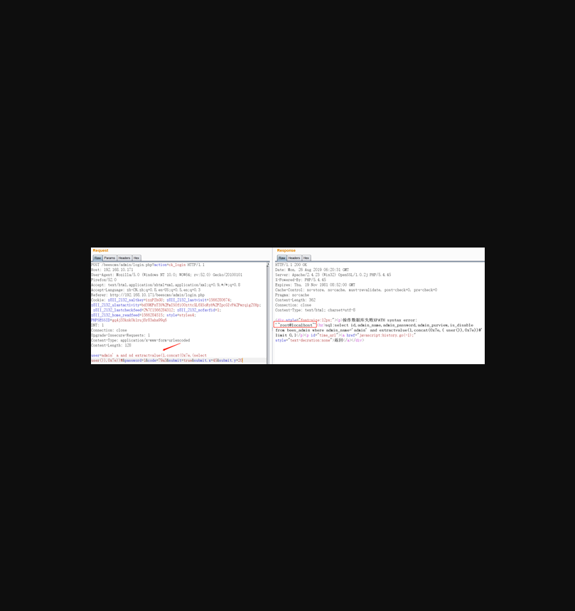经过测试,发现user字段除了存在布尔注入,还存在报错注入