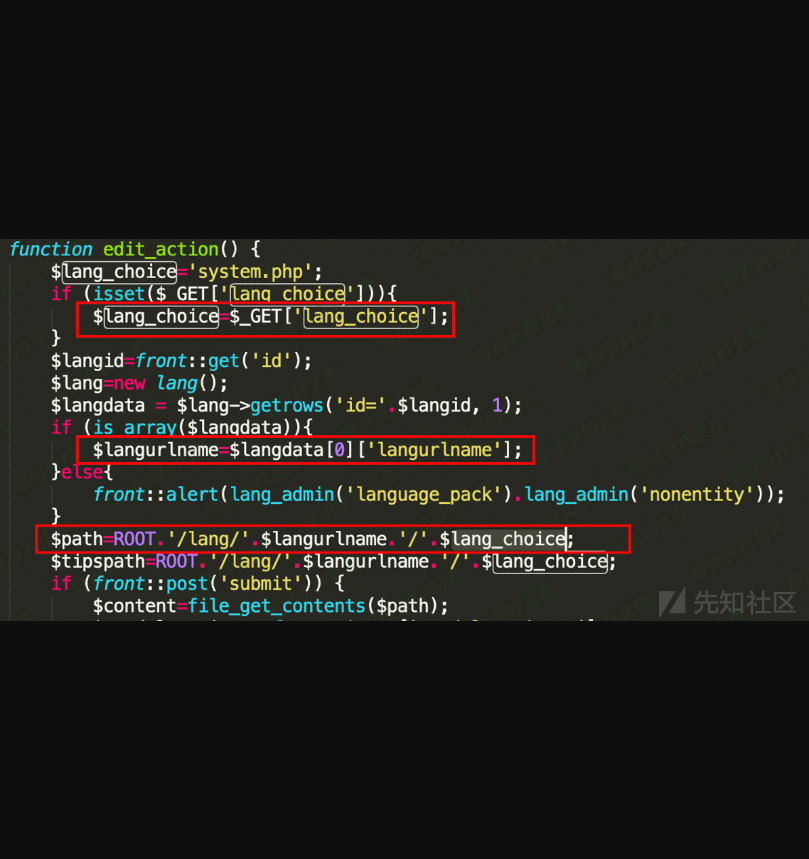 $lang_choice是从用户的GET请求参数中直接获取的,$langurlname是从数据库中获取的langurlname字段。后面将这两个参数直接拼接路劲赋值给$path,这里的$lang_choice拼接在最后,可以任意赋值(为后面文件包含导致命令执行奠定基础)。