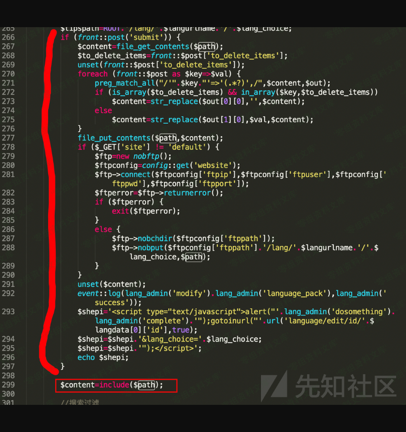 接着由于266行判断POST参数是否有submit,我们可以直接不传这个参数来绕开这一段的代码执行,到299行直接通过inlcude函数包含我们任意传递的值,导致文件包含