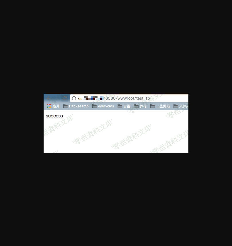 该shell的作用是向wwwroot下的test.jsp文件中写入任意字符串,如:http://www.0-sec.org:8080/wwwroot/indices/yz.jsp/snapshot-yz.jsp?f=success,我们再访问/wwwroot/test.jsp就能看到success了: