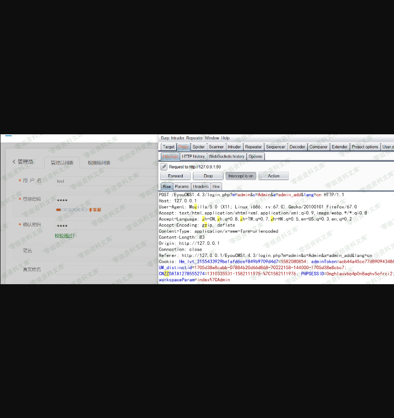 登陆后台,在高级选项>管理员>新增管理员点击之后截包