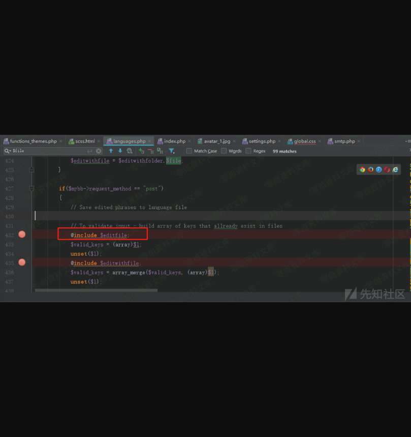 首先全局搜索inclued函数,在\mybb\admin\modules\config\languages.php页面的432行发现include函数:\@include $editfile;