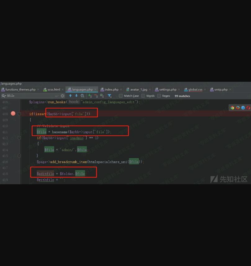 现在文件的目录结构分析完毕,接下来查看该漏洞页面的接口位置:由于该文件目录为\mybb\admin\modules\config\languages.php,因此,入口为config模板的language方法中,其中控制器为edit,从369行可以看到,同时408行看到post请求中输入file文件