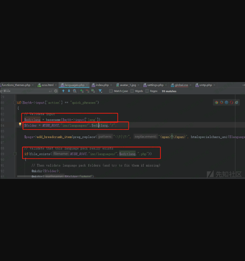 通过该文件84行看到foler文件夹为MYBB_ROOT."inc/languages/".$editlang."/",接下来查看editlang变量,通过89行看到判断该文件名后缀为php的文件是否存在,然后查看该文件下辖的php文件只有english文件,猜测editlang为english,稍后验证,该变量会通过post请求输入