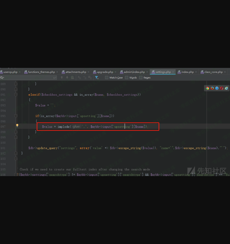 对该变量进行跟踪,$mybb->settings['avataruploadpath'],发现对$mybb->settings[\'uploadspath\']变量的控制就需要对文件进行修改进行查询,针对关键函数进行搜索:$db->update_query("settings"发现在\mybb\admin\modules\config\settings.php文件下1101行: