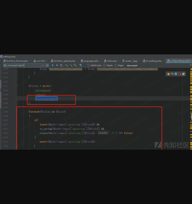 我们跟踪avataruploadpath变量,进行搜索,有1042行定义数组,而avataruploadpath为数组中的参数,同时也有post请求的upsetting数组进行输入: