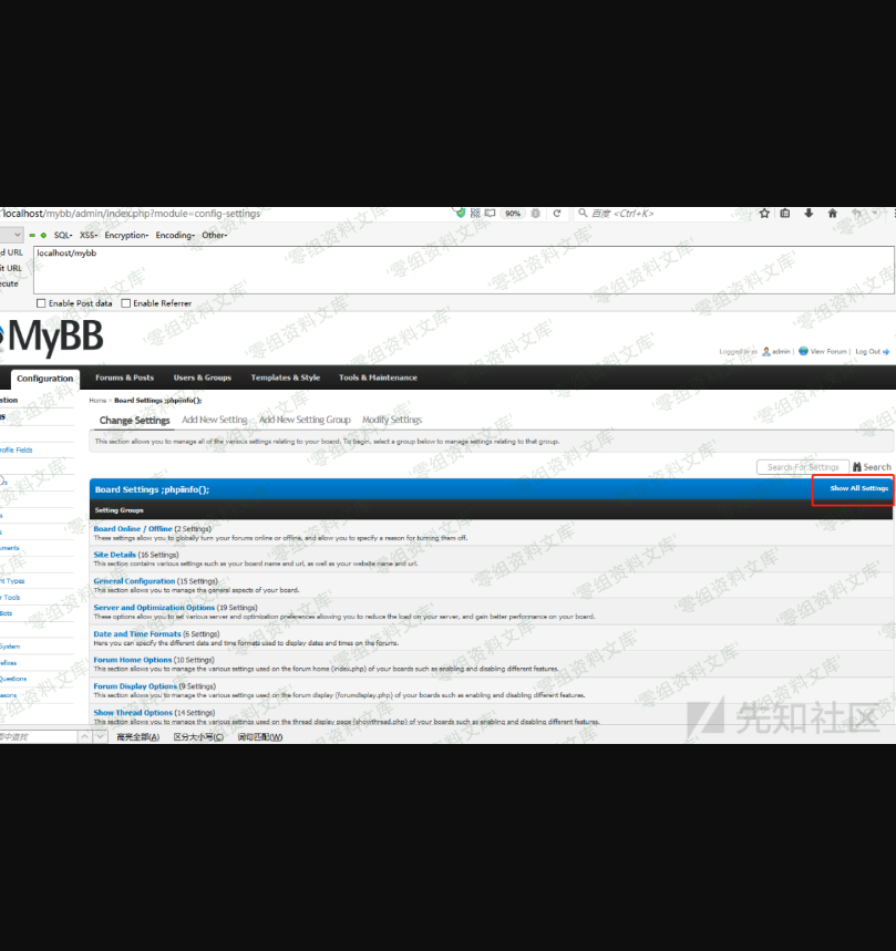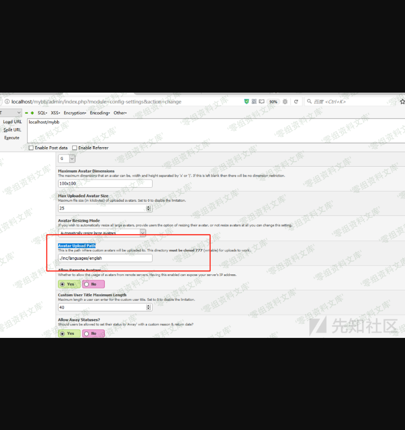 修改avataruploadpath值为./inc/languages/English,查看所有的settins变量:链接:http://www.0-sec.org/mybb/admin/index.php?module=config-settings&action=change