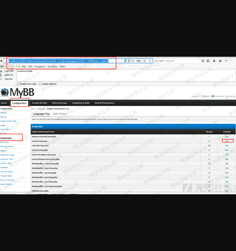 点击save user发现文件已经上传成功,并且avataruploadpath也修改成功,下面进行包含操作,访问url:http://www.0-sec.org/mybb/admin/index.php?module=config-languages&action=edit&lang=englishConfig模块下的languages下,