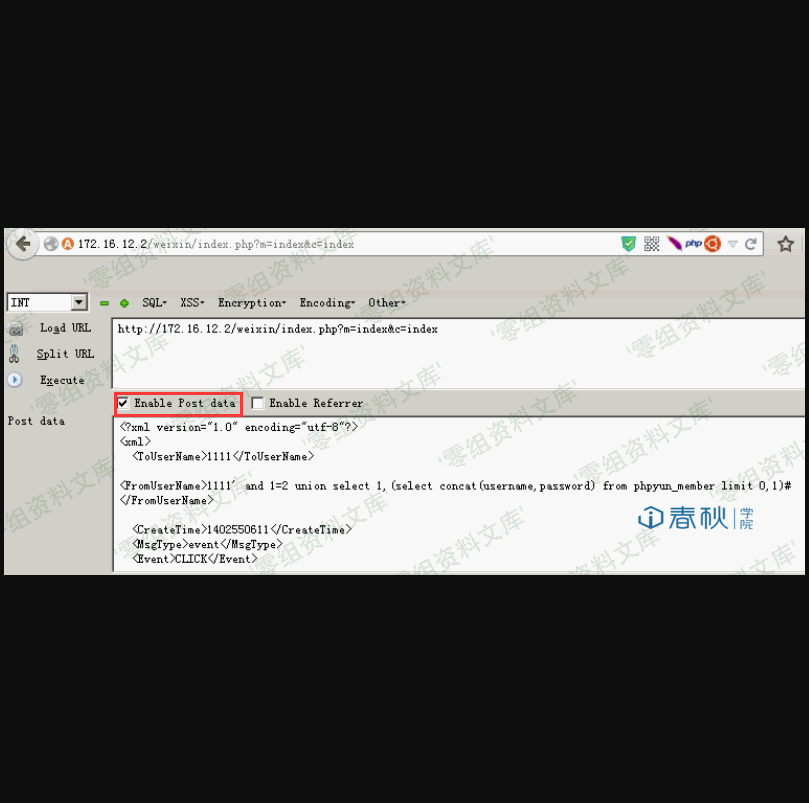 这个时候已经是登录状态,我们按F9 调出 Hack Bar 的界面,点击Enable Post data ,将Payload写入输入框,如下图所示: