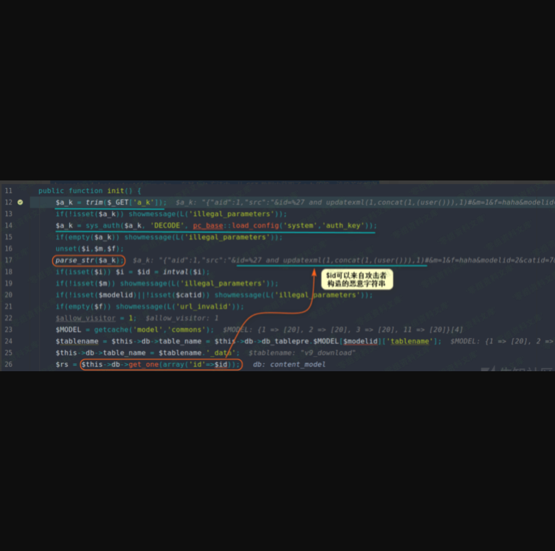 这个版本的 SQL注入 主要在于程序对解密后的数据没有进行过滤,我们来看一下漏洞文件 phpcms/modules/content/down.php 。在其 init 方法中,从 GET 数据中获取了 a_k 的值,该值若能解密成程序规定格式的字符串,则程序继续运行(这里加解密使用的秘钥必须一致,例如这里秘钥为 pc_base::load_config(\'system\',\'auth_key\') )。程序将解密后的数据用 parse_str 函数处理,这里又存在变量覆盖问题。然后将可控变量 $id 带入数据库查询,我们跟进 get_one 方法。