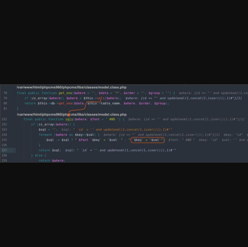 get_one 方法调用了 sqls 方法,而在 sqls 方法中可以明显看到,未过滤的数据直接拼接进了 SQL 语句中。