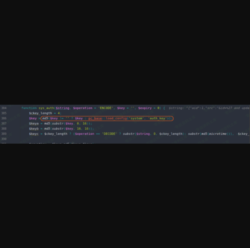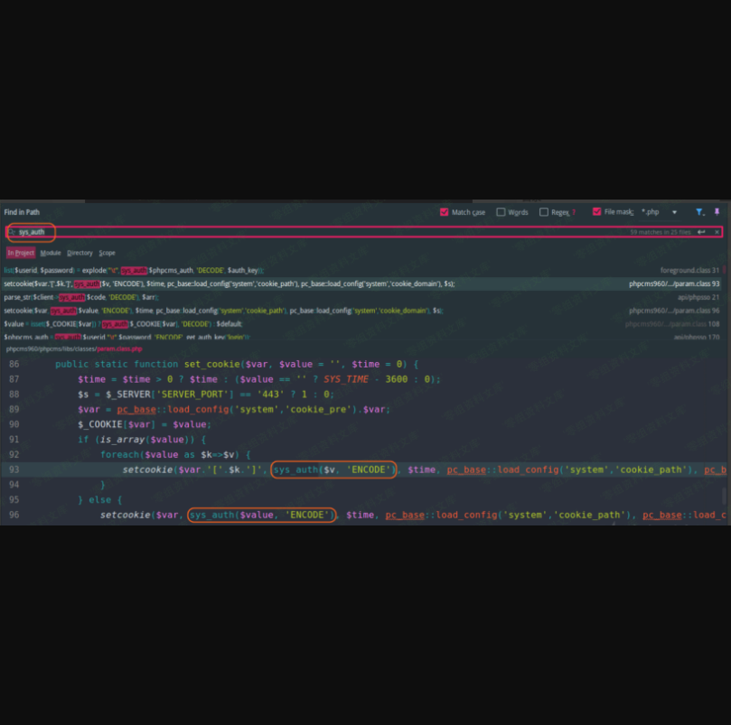 那么现在,我们要解决的问题是:如何构造出加密数据,使得数据能够被正常解密?我们先来看一下 sys_auth 函数的代码,其代码位于 phpcms/libs/functions/global.func.php 中。开头我们可以很明显看到,当我们没有指定加解密用的 key 时,系统默认使用 pc_base::load_config(\'system\',\'auth_key\') 作为 key ,这样我们就不用特地去搜索形如 sys_auth(\'xxx\',\'ENCODE\',pc_base::load_config(\'system\',\'auth_key\')) 的代码段,直接搜索形如 sys_auth(\'可控字符串\',\'ENCODE\') 或 sys_auth(\'可控字符串\') 的代码段即可。(这里搜索这种代码段的目的,是为了找到可利用的点将恶意 payload 进行加密,然后传输给开头 phpcms/modules/content/down.php 文件的 init 方法进一步利用)