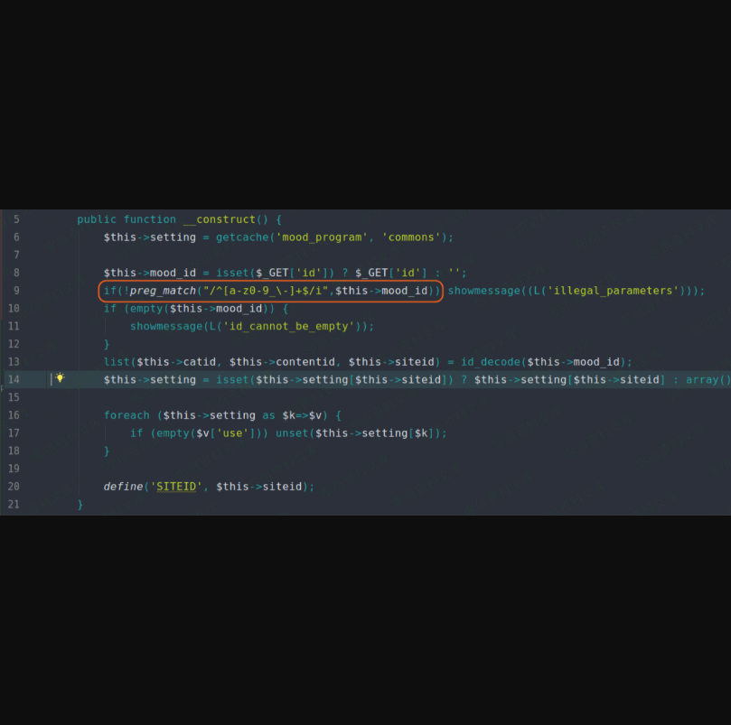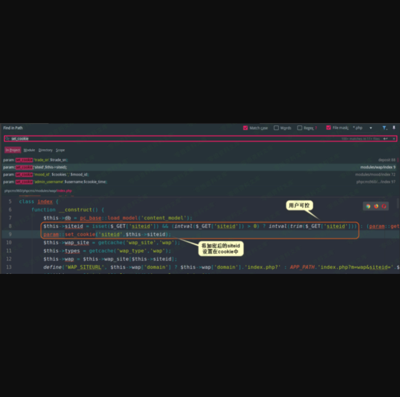 我们可以搜到 phpcms/modules/wap/index.php 文件,在该文件中 $_GET[\'siteid\'] 可控,并且可以通过 cookie 获得加密后的数据,但是这里有 intval 过滤,所以无法放置我们的 payload 。