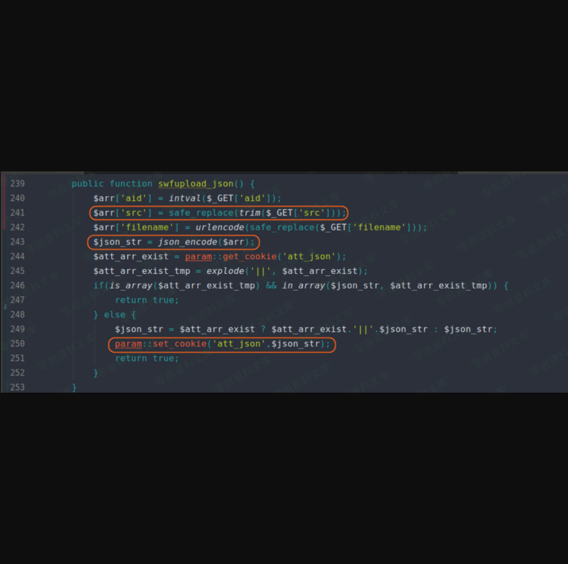 我们继续寻找,会发现 phpcms/modules/attachment/attachments.php 文件的 swfupload_json 方法有满足我们需要的代码。程序将可控数据放在了 cookie ,其中可控数据中,比较好利用的是 $_GET[\'src\'] 。