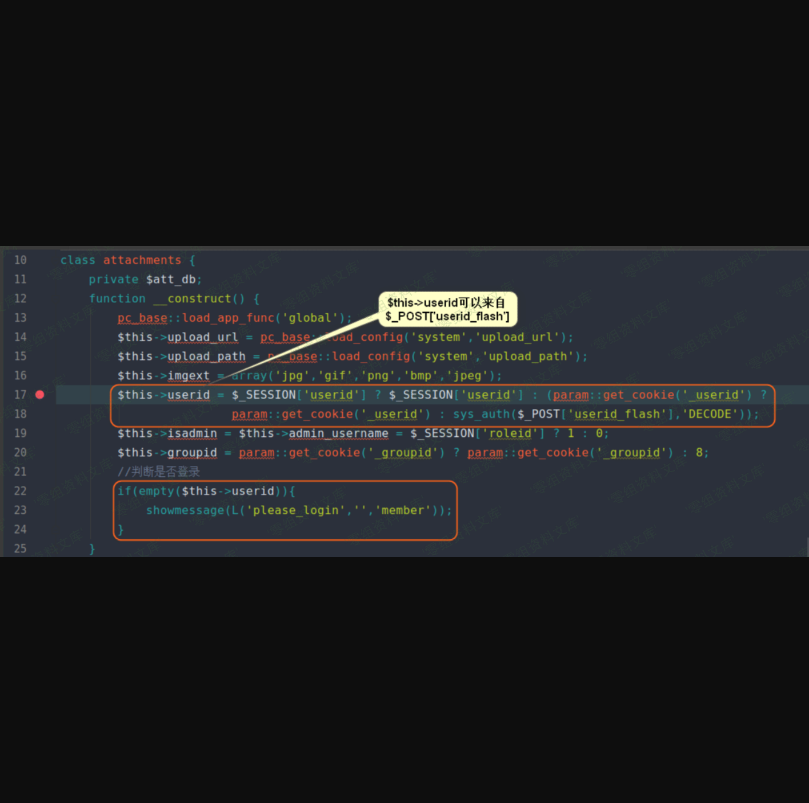 貌似现在已经找到了利用链了?别高兴的太早。在调用这个 swfupload_json 方法之前,程序会执行 attachments 类的 __construct 方法,而这个方法中有用户登录状态检测。用于登录状态检测的 $this->userid 可以来自 sys_auth($_POST[\'userid_flash\'],\'DECODE\') ,即我们让 $_POST[\'userid_flash\'] 经过 sys_auth 方法解密之后有东西即可。而这个加密数据,就可以利用我们上面说到的 phpcms/modules/wap/index.php 文件。通过 cookie 获取 $_GET[\'siteid\'] 加密后的数据,然后再作为 $_POST[\'userid_flash\'] 的值,即可绕过登录检测。