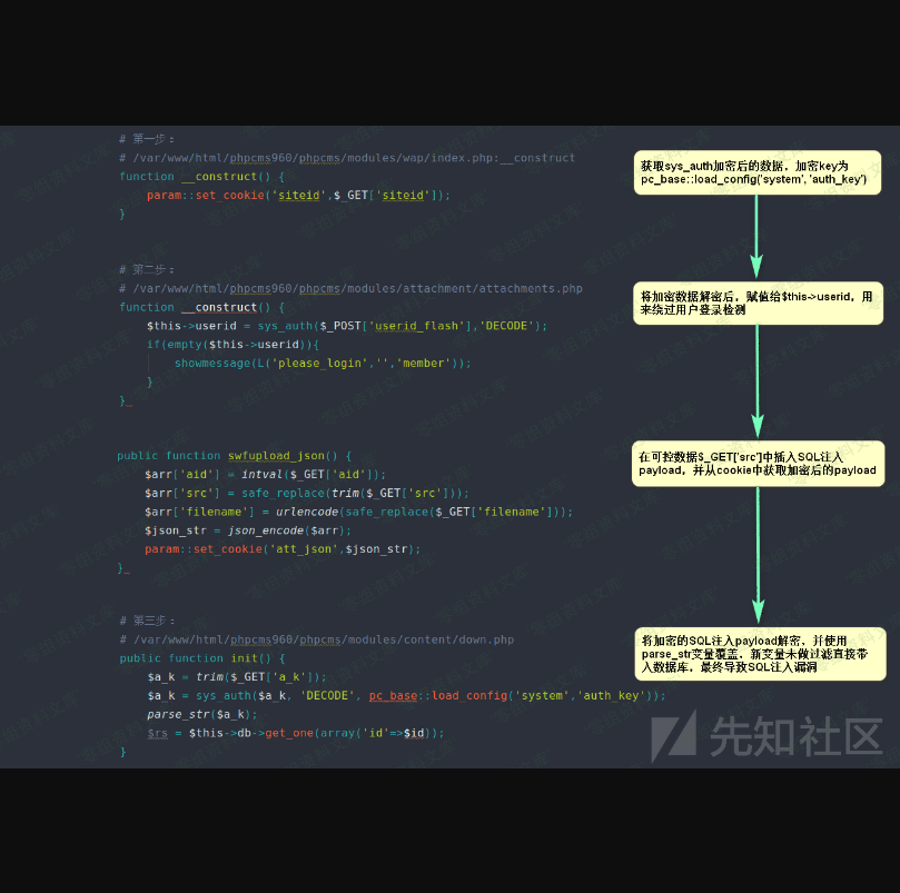 绕过登录检测后,我们将 payload 传给 phpcms/modules/attachment/attachments.php 文件 swfupload_json 方法中的 $_GET[\'src\'] ,再利用开头 parse_str 函数进行变量覆盖,最终完成整个漏洞链。整个漏洞的利用流程图如下: