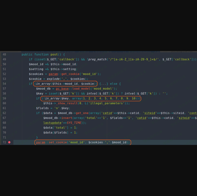 我们再来假设,如果网站管理员删除了 WAP 模块的代码,这个洞还能利用吗?我们可以继续来挖掘一下这个漏洞链的其他入口,这也是网络上未公开的一个入口点。上面我们在搜索 set_cookie 方法找可控数据时,会发现 phpcms/modules/mood/index.php 文件的 post 方法可以直接获得一个加密后的数据,这样我们就可以将这个数据,用在漏洞链的第二步:绕过用户登录验证,具体代码如下: