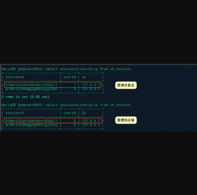 PHPCMS 专门在数据库中建了一个表来存放 PHPSESSID ,其中也包含管理员的 PHPSESSID ,且登录状态下的 userid 字段会被设为1,注销则为0,具体如下: