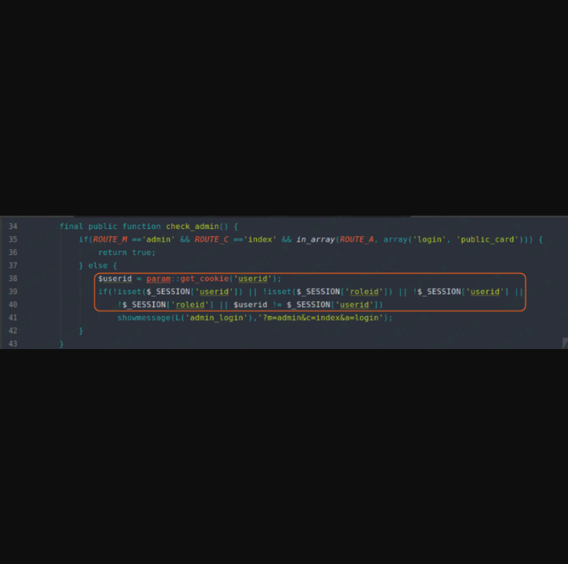 可以明显看到,我们原先的 cookie 中少了 $userid 对应的字段,而且要想绕过登录,必须保证 $_SESSION[\'roleid\'] 和 $userid 相等且它们两者非空。那么现在,我们只要加上 $userid 对应字段就行了,其值可以从上面漏洞链第一步中的响应包 Set-Cookie 字段获取。这里要注意一个点,一旦管理员注销,我们就无法利用这个点伪造 cookie 了,这也是这个漏洞的鸡肋之处。