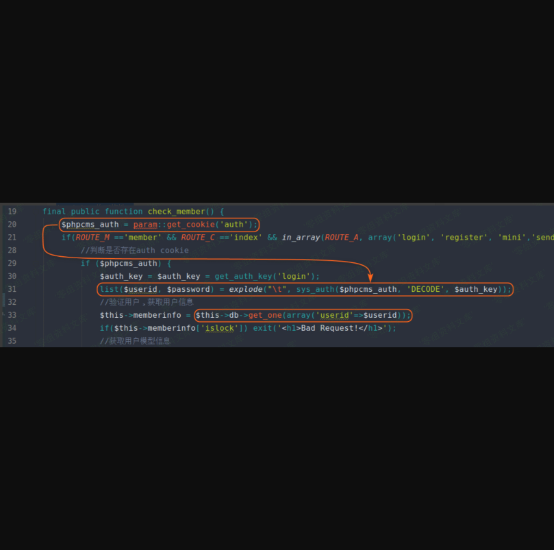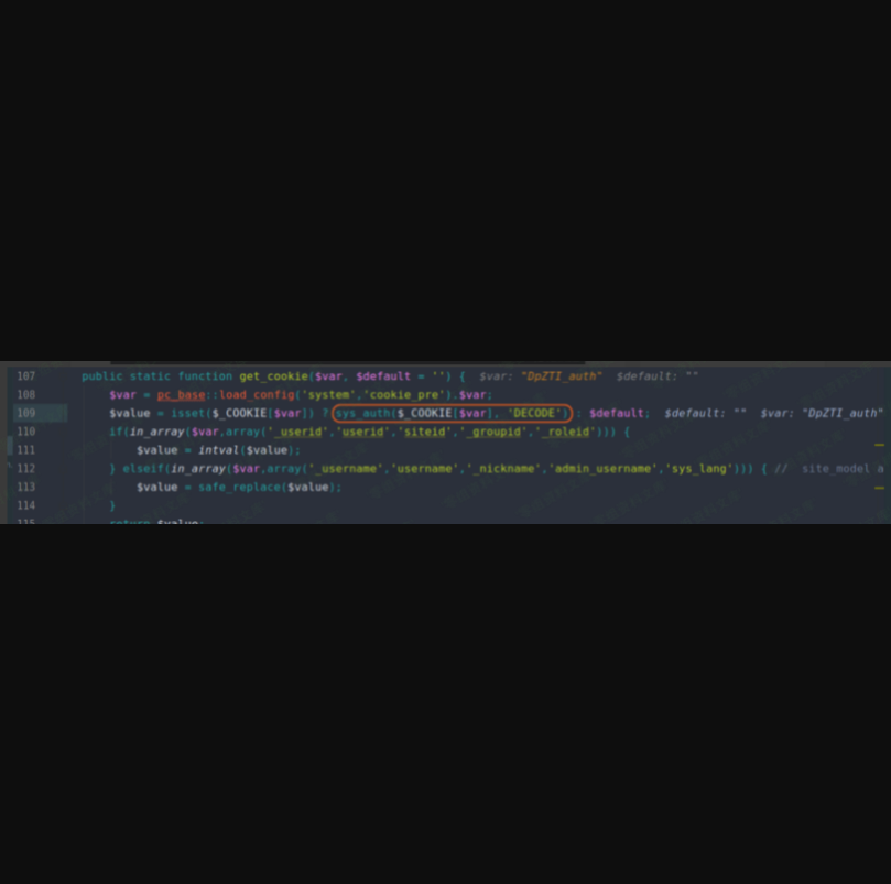我们先来看一下待解密数据 $phpcms_auth 如何构造。从下图中,可以看出程序将从 cookie 中的 xxx_auth 字段经过 sys_auth 函数解密后,返回给了 $phpcms_auth ,而默认情况下使用 pc_base::load_config(\'system\', \'auth_key\') 作为加解密的 key 值。