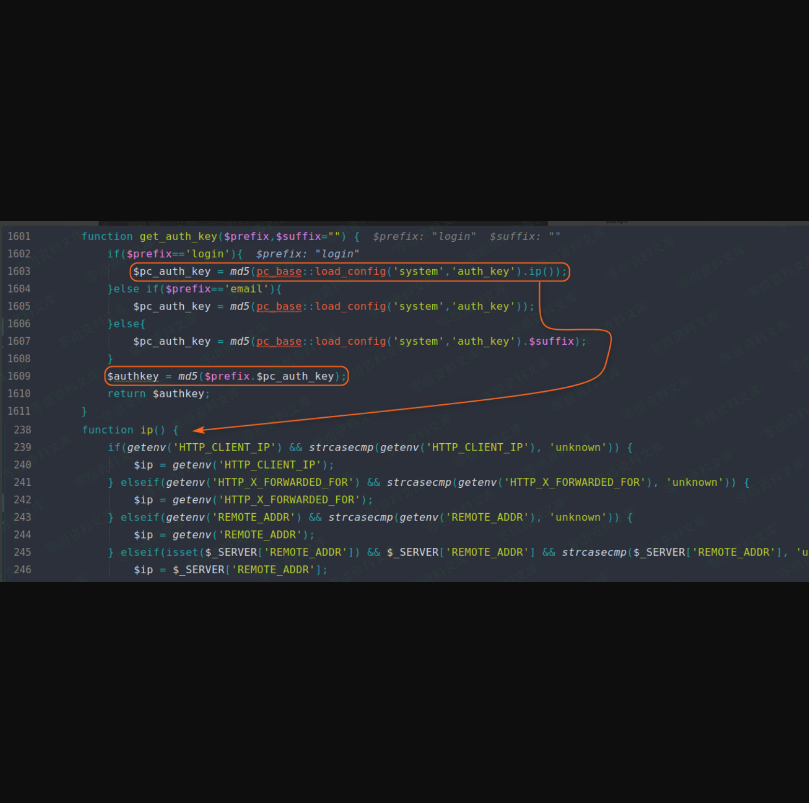 现在 $phpcms_auth 已经搞定了,我们再来看看 $auth_key = get_auth_key(\'login\') 如何构造,跟进 get_auth_key 的代码。我们可以看到 $auth_key 由 $prefix、pc_base::load_config(\'system\',\'auth_key\')、ip() 三个元素决定。前两个都是已知的,而第三个获取用户IP的函数存在IP伪造的问题,也可以是固定的。