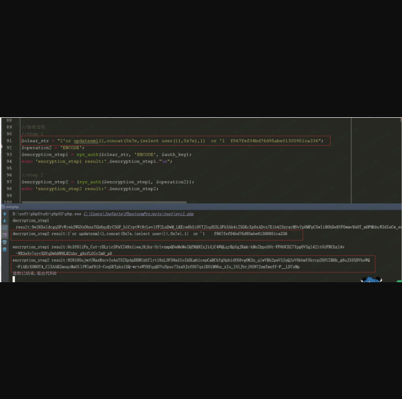 $clear_str = "1'or updatexml(1,concat(0x7e,(select user()),0x7e),1) or '1 f867fef04bd76d95abe01300951ca336";