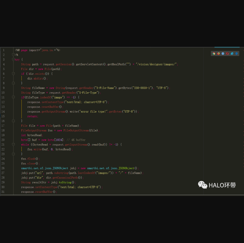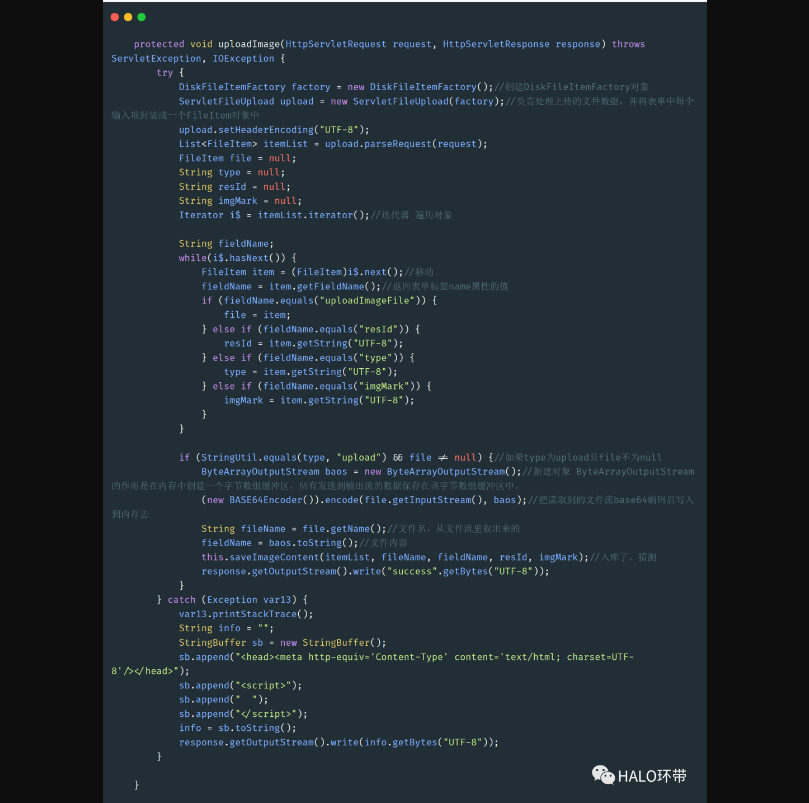 挖注入不是我的本来目的,任何以渗透测试为目的的代码审计最终的目标都是RCE或者任意文件上传。于是我继续寻找涉及文件操作的相关代码。PS:此处踩了很多坑。通过寻找web.xml里的配置信息。我快速定位到了一处上传接口UploadImageServlet。跟进看看