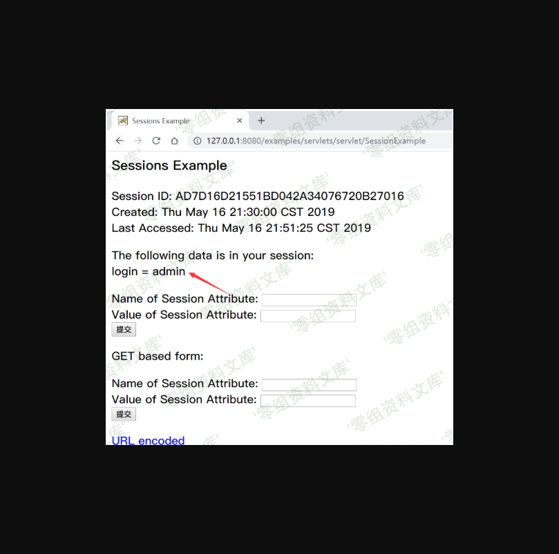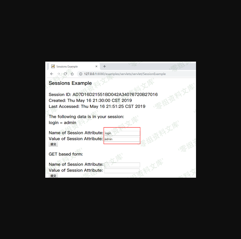 我们访问该SessionExample页面,该页面可以对Session进行操控,本来该页面是Apache tomcat用来给开发者操纵Session示例的页面。但是,如果实际生产环境中不删除该页面的话,可能存在伪造任意用户身份的漏洞。
