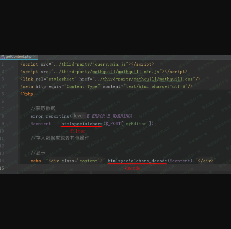入进行了过滤,但是在14行输出时却使用了htmlspecialchars_decode,造成XSS漏洞。