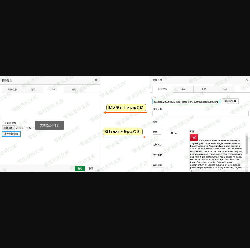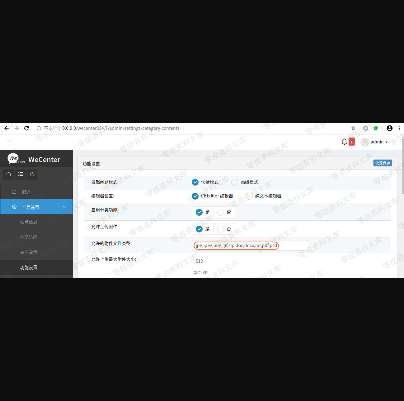 WeCenter 后台的 允许的附件文件类型 处,设置了用户可上传的文件类型后缀。而这个配置是写在数据库中的,我们可以利用前面的任意 SQL 语句执行的 POP 链,往字段中添加 php 文件后缀。