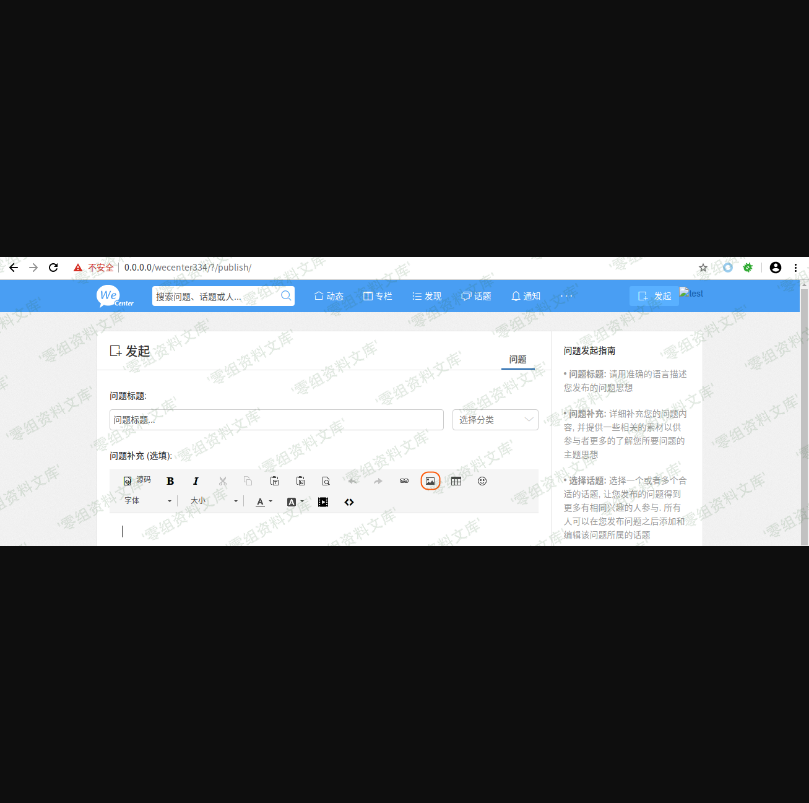 这里以 RCE 利用为例子。我们先用上面的 EXP 生成文件,然后找个可以上传文件的地方。这里要注意,一定不要选择在用户头像处上传。这里我们通过发起问题的地方来上传文件。